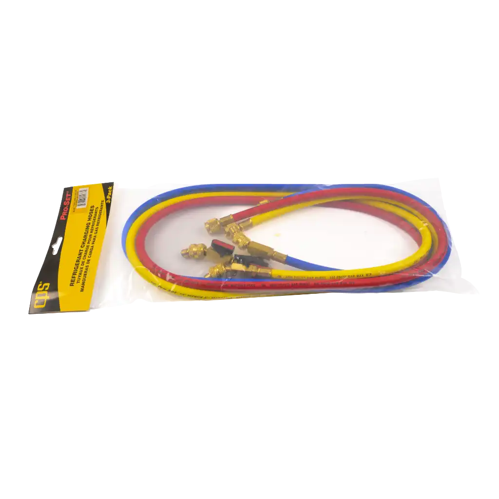 The Ball Valve Hose HK5E CPS premium conversion hose set is engineered for professional HVAC/R technicians who need precision, safety, and compatibility with modern systems. This 5 ft (150 cm) hose set includes three color-coded hoses—Red, Yellow, and Blue—making system identification quick and intuitive on the job. Each hose features a 45° ball valve with 1/4″ SAE female to 5/16″ (1/2″-20 UNF) female fittings, delivering smooth connections for today’s high-pressure applications.